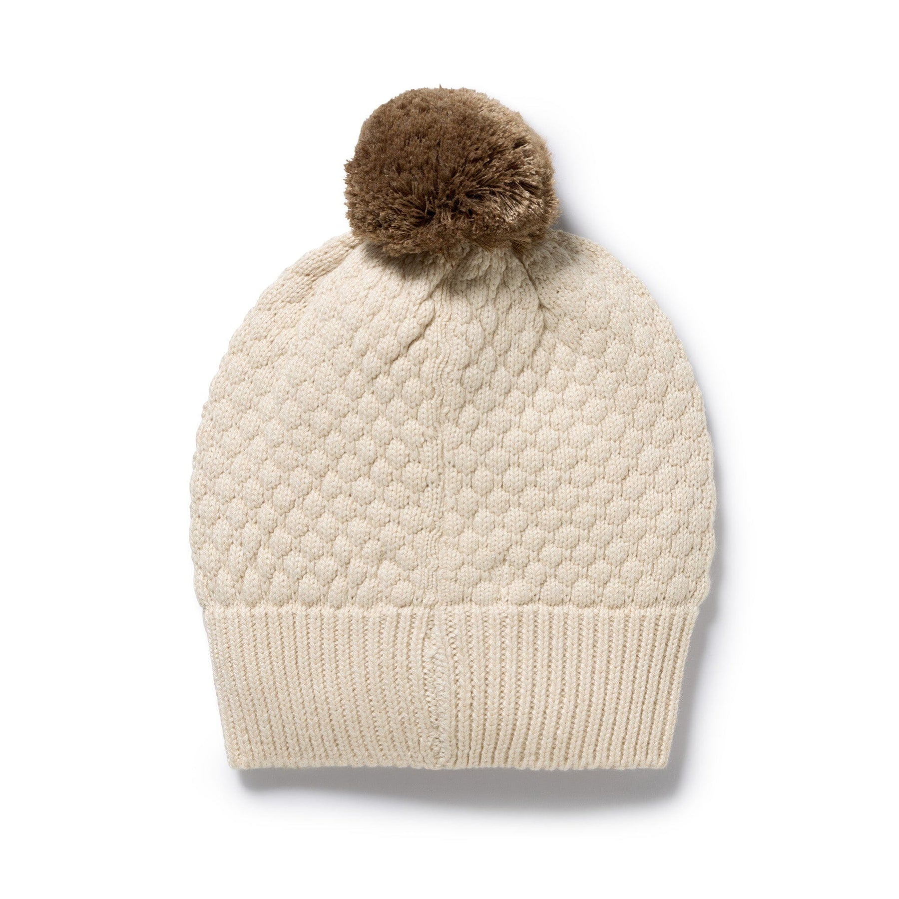 Warm up little heads this winter with this adorable bubble knit hat from Wilson and Frenchy. Made from a cosy blend of organic cotton, bamboo, and wool, this eco-friendly hat is soft on delicate skin and perfect for chilly days. Featuring a textured bubble knit design, playful pom pom, and a soft ribbed turn-up cuff, it's a must-have winter accessory to keep your little one both cosy and stylish.