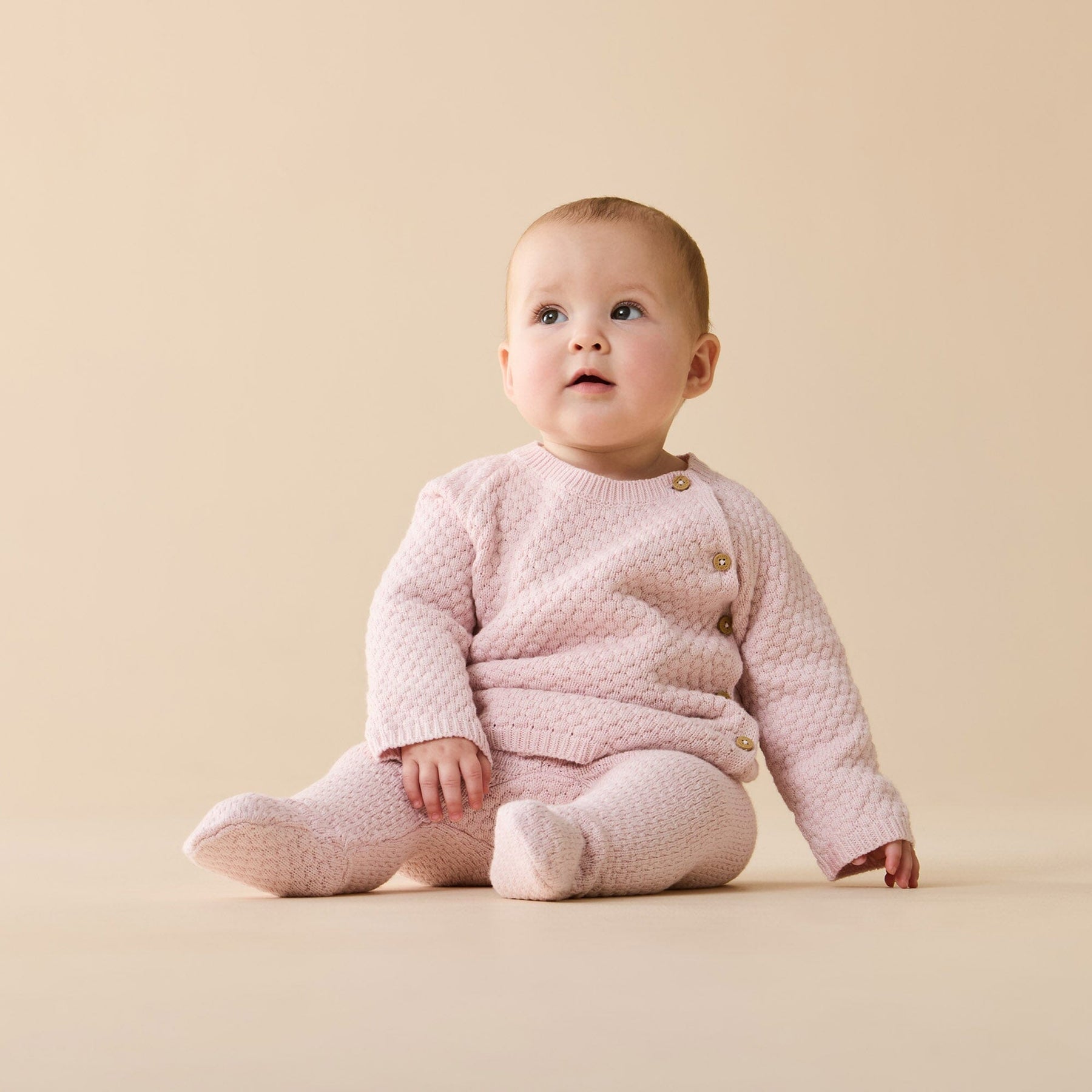 Stay cosy and stylish with these knitted baby leggings by Wilson and Frenchy featuring a sweet bauble design. Made from a soft and breathable blend of organic cotton, bamboo, and wool, these leggings are perfect for keeping little legs warm and comfy all day long. The gentle elastic waistband ensures a snug fit without digging into delicate tummies. A must-have for everyday wear during the cooler months.