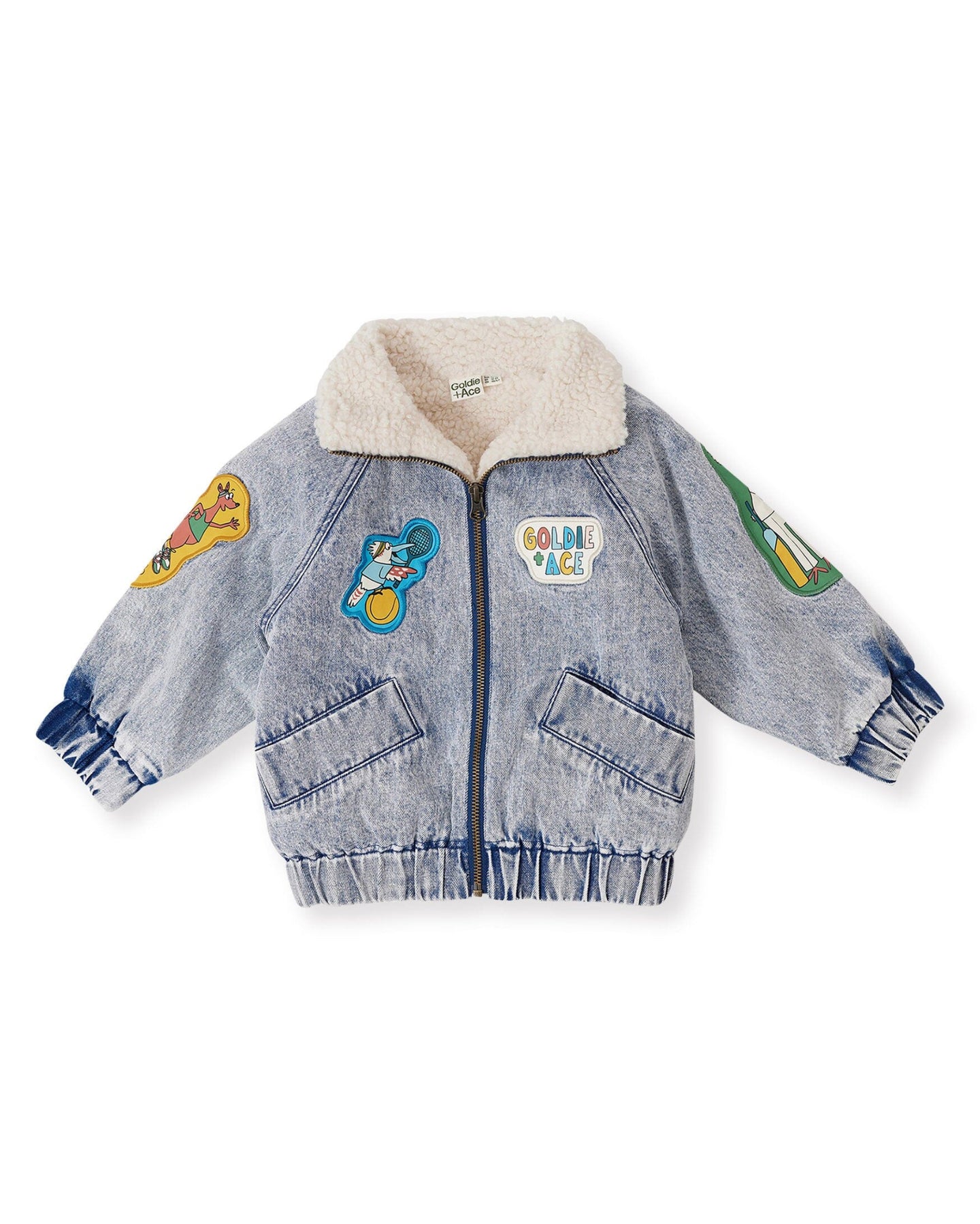 Keep your little one cozy with this blue denim jacket from Goldie + Ace. Featuring a faux shearling lined body and hood, it offers extra warmth. The heavy weight corduroy and wadded sleeves add durability, while the zip-through front and functional pockets provide practicality. Illustrated signature patches add a unique touch.