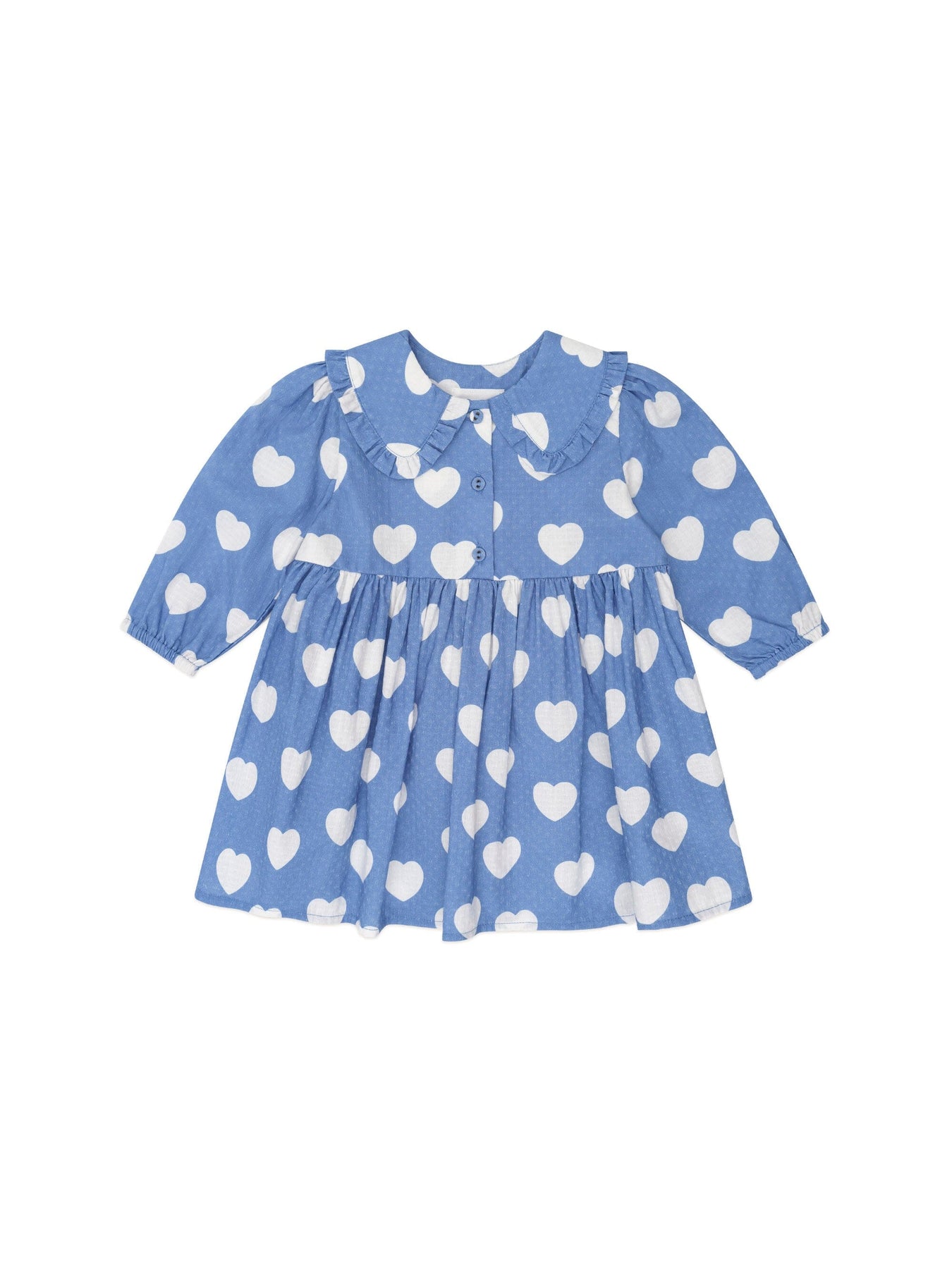 The sweetest classic vintage style frill dress. Made from ultra soft 100% organic cotton, it features a frilly collar with heart embroidery detail, button down snaps, a full, tiered skirt and exaggerated puff sleeves.