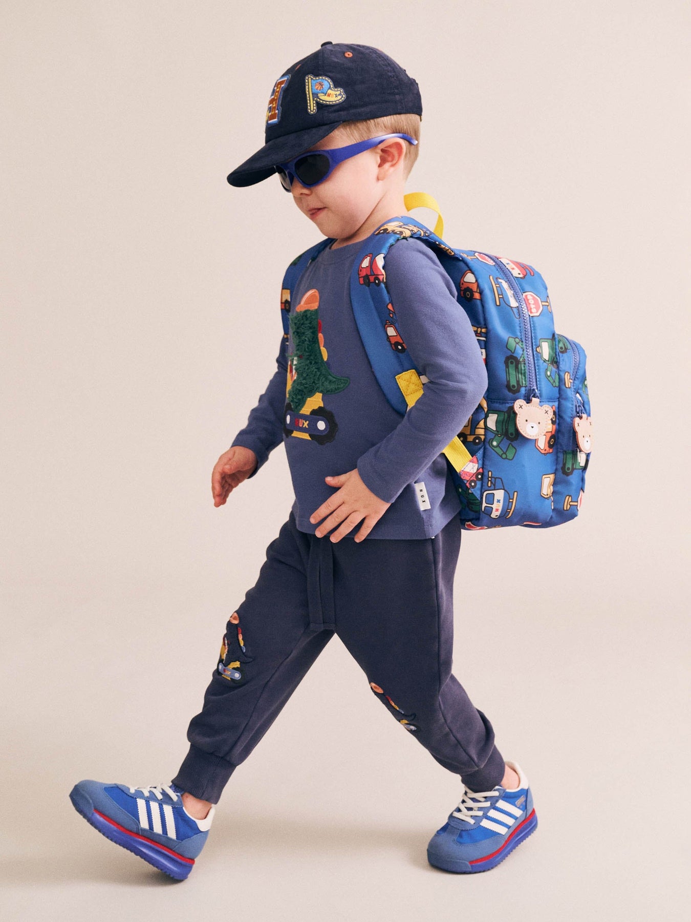 A long-sleeved round neck top in vintage blue. Made from cloud-like organic cotton, it features tummy-sized tradie dino embroidery. Baby sizes include stainless steel shoulder snaps for even easier dressing.