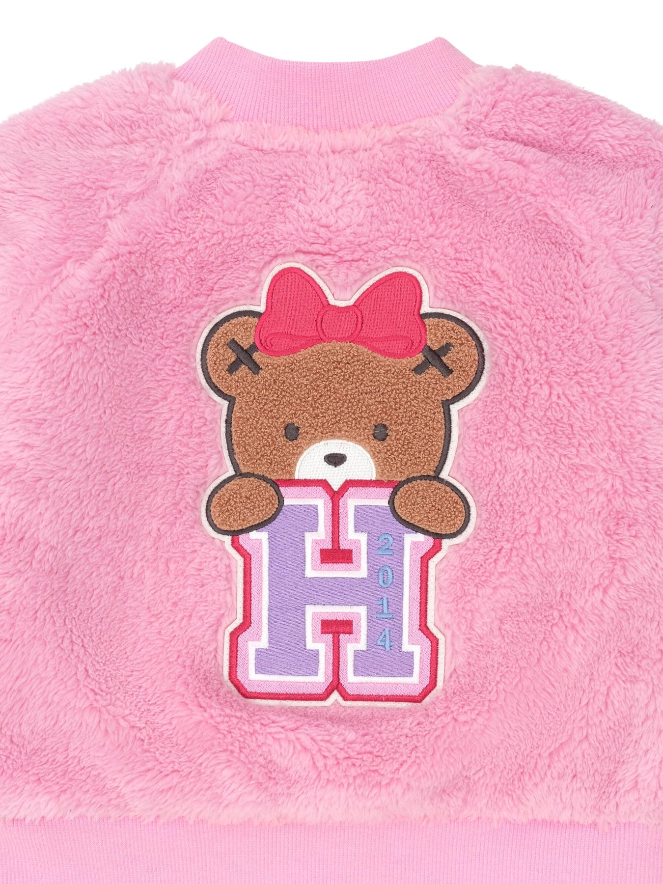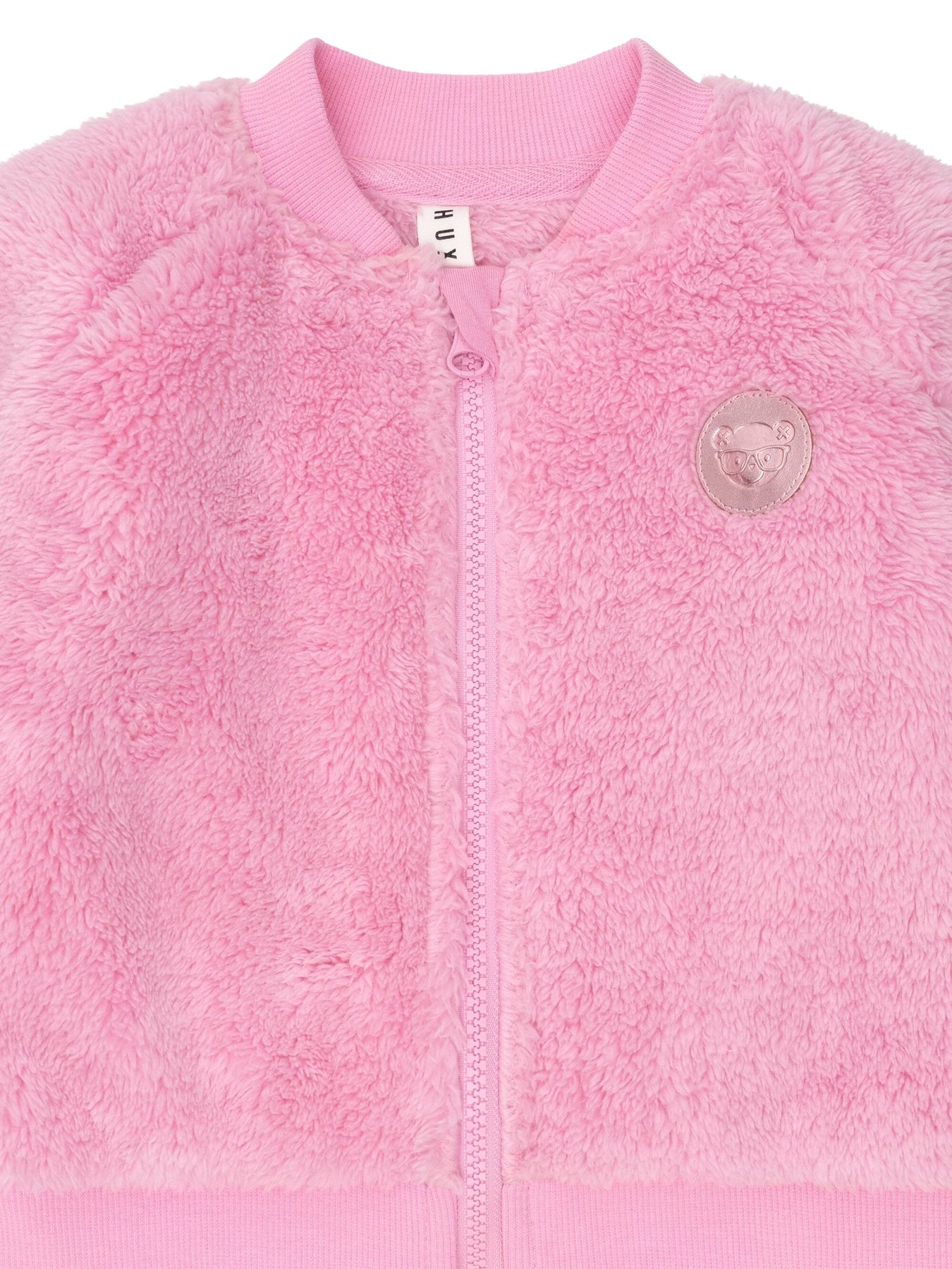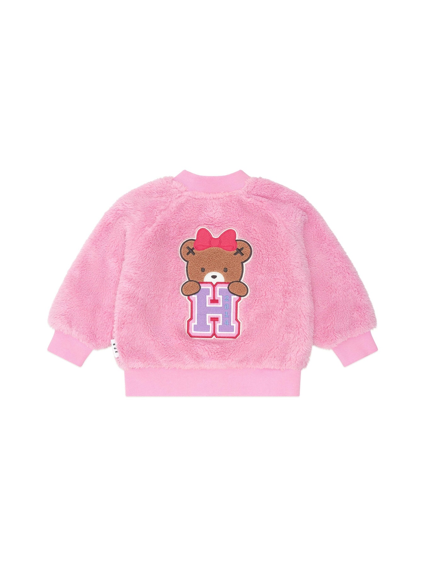 A soft and furry varsity jacket perfect for layering on colder days. Made with extra furry fabric, this cool weather must-have feels like a hug you can wear. It has a zip for easy dressing and custom Huxette embroidery.