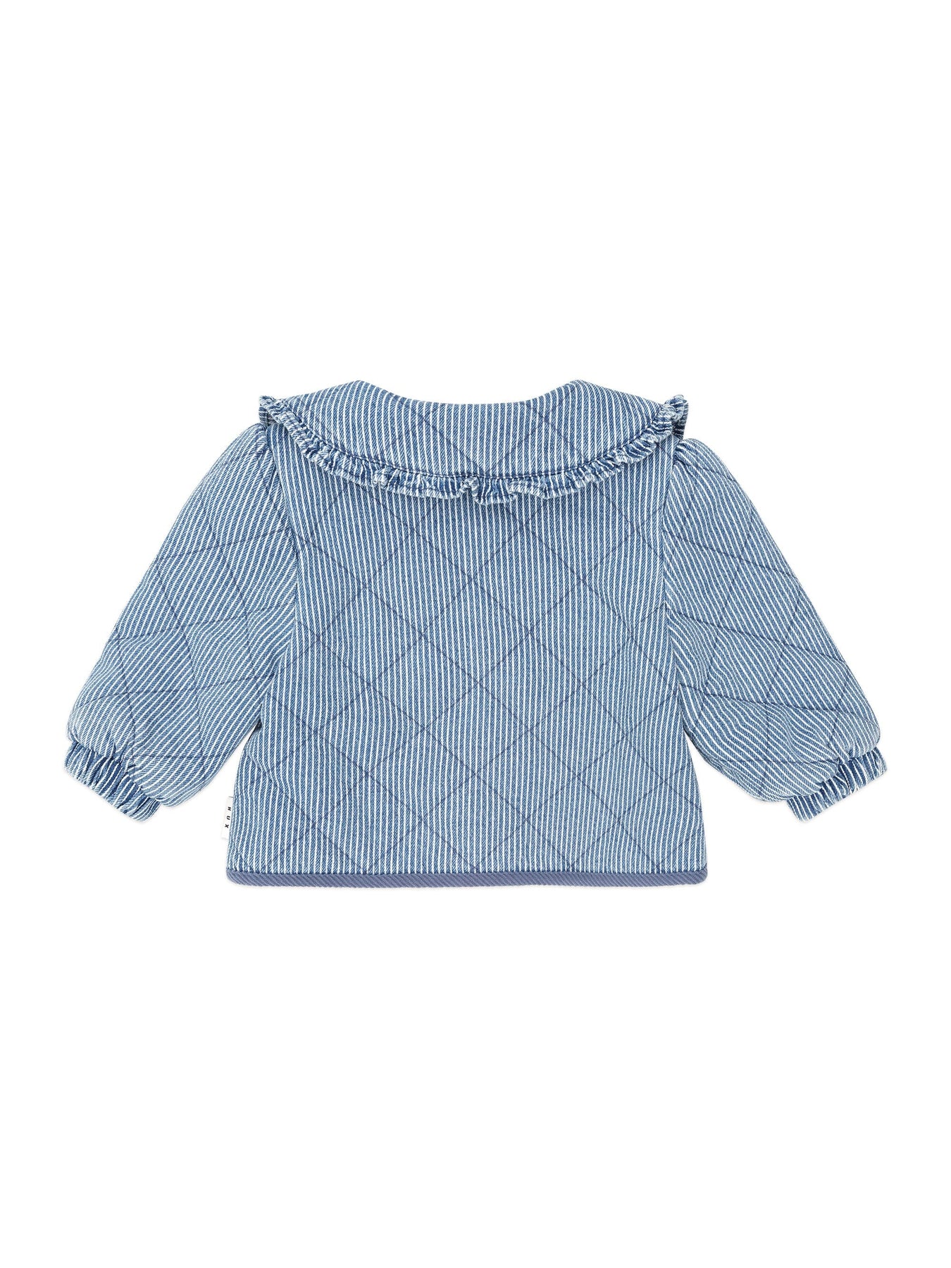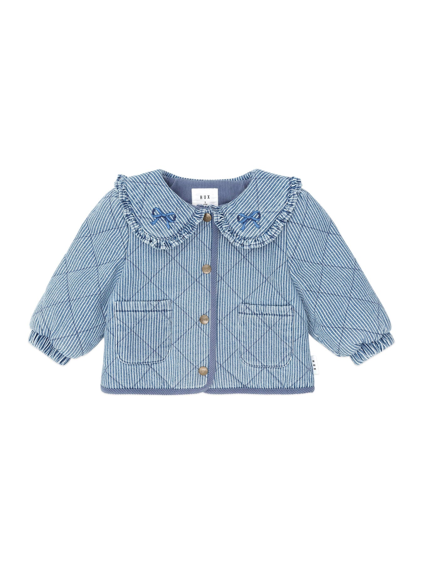 The prettiest denim jacket. This vintage style jacket is made from soft-as-butter quilted denim. Featuring a frilled peter pan collar with custom embroidered bows, antique brass snap buttons and front pockets for snacks on-the-go, it doesn’t get much cuter than this.