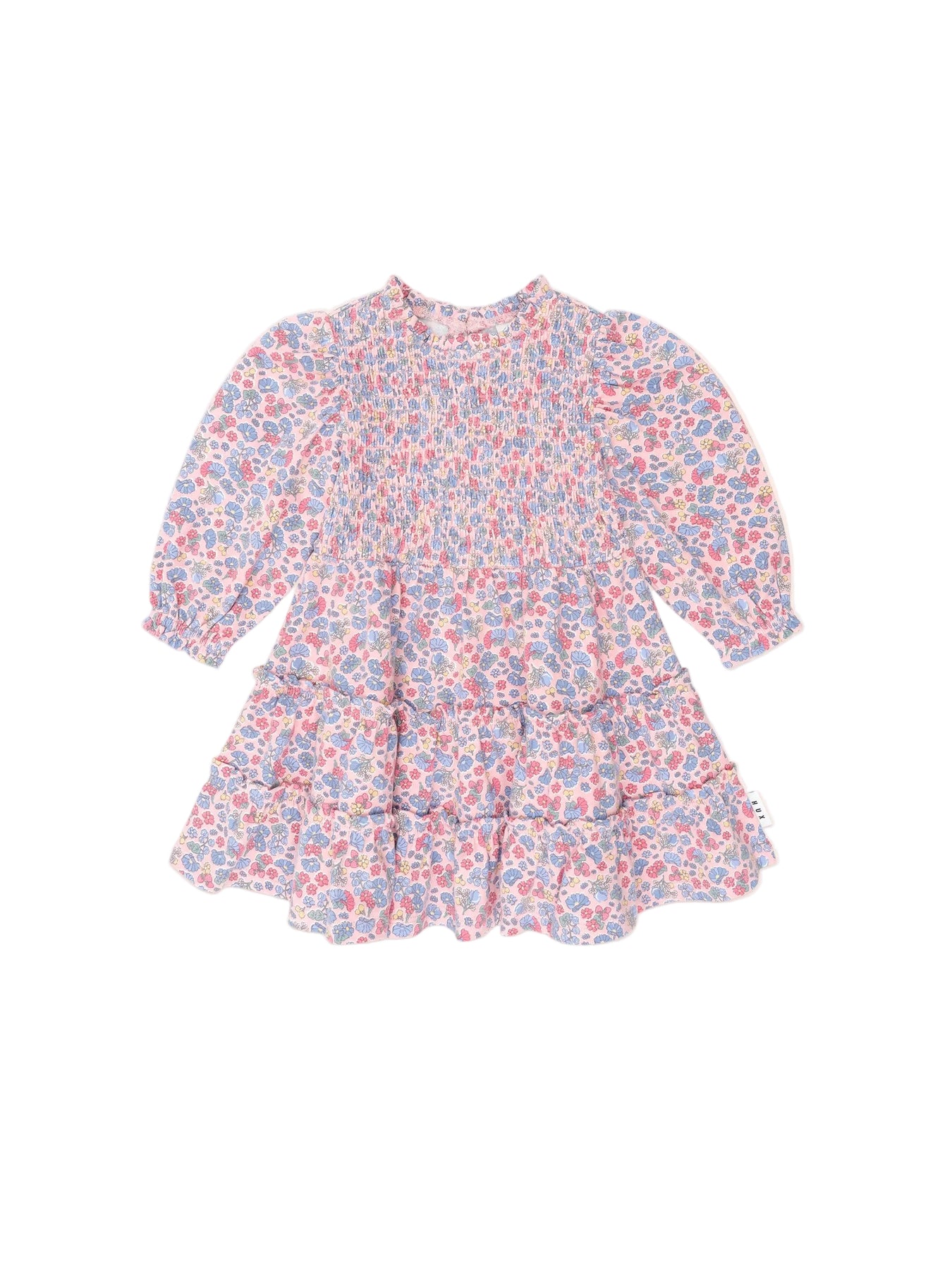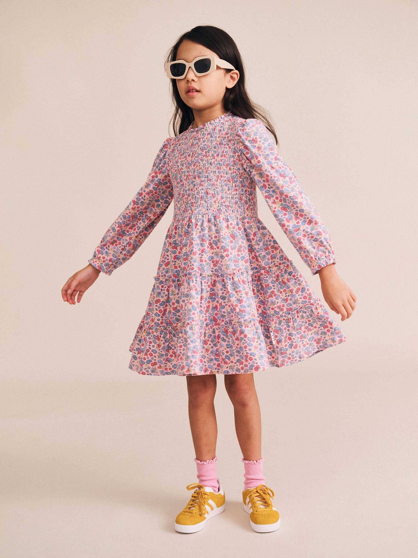 Be best dressed in this pretty long sleeved dress. Made from soft organic cotton in our custom floral print, it has a stretchy shirred bodice, puff sleeves, and a tiered skirt made for twirling. Bring on the dancefloor.