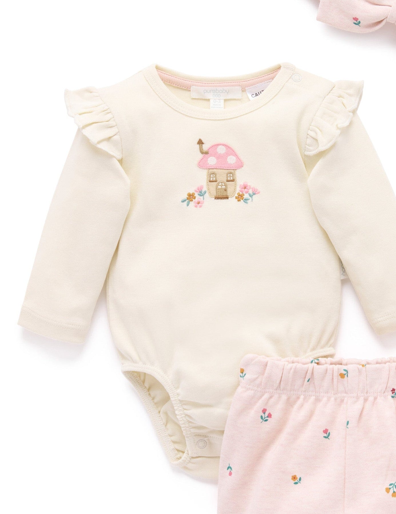 Our Toadstool 3 Piece Set is the perfect blend of essential layers for your little one. Featuring a snap clip bodysuit with a toadstool house applique and shoulder ruffle detail, printed leggings and a matching bow headband. Made from our 100% Organic Cotton for a soft touch against their delicate skin. This set makes the perfect gift! 3 piece set Bodysuit with toadstool house applique and ruffle details Snap clips on the bodysuit for easy dressing Elasticated waistband on leggings