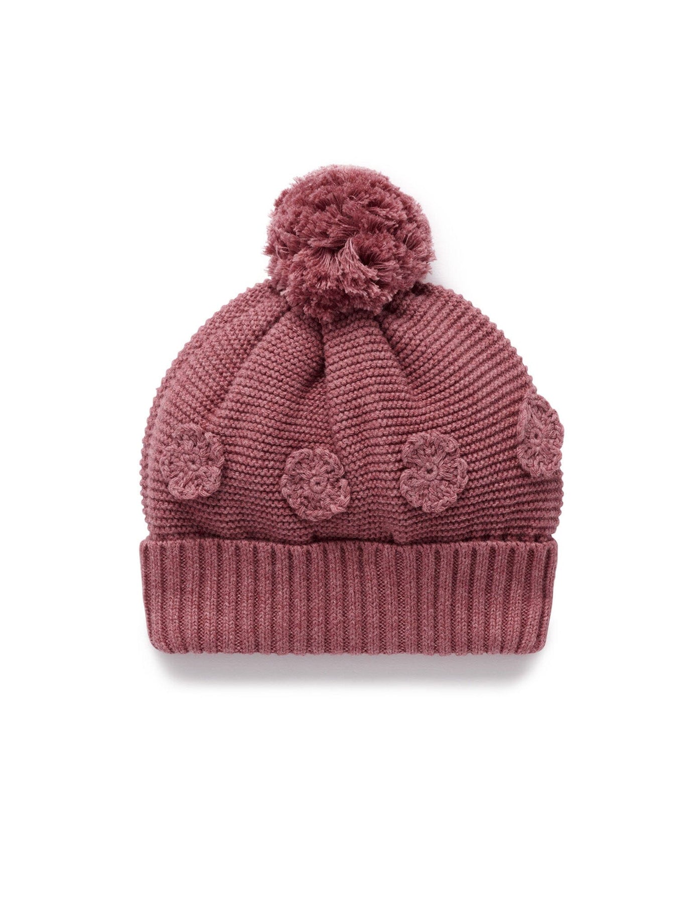 Our Crochet Flower Beanie, knitted in a thick stitch, is a warm and cosy winter piece. Featuring a fun pom pom detail and sweet 3D crochet flowers, it is the perfect accessory to complete any outfit. Made in soft organic cotton yarn with a touch of wool, this is a comfortable hat that won't itch.