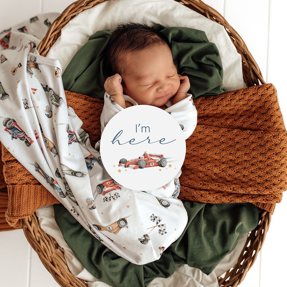 Our Snuggle Hunny organic cotton jersey wrap with matching beanie is soft, snuggly and stretches with baby. This wrap features our exclusive Snuggle Hunny Little Racers design and is made with Organic Cotton.