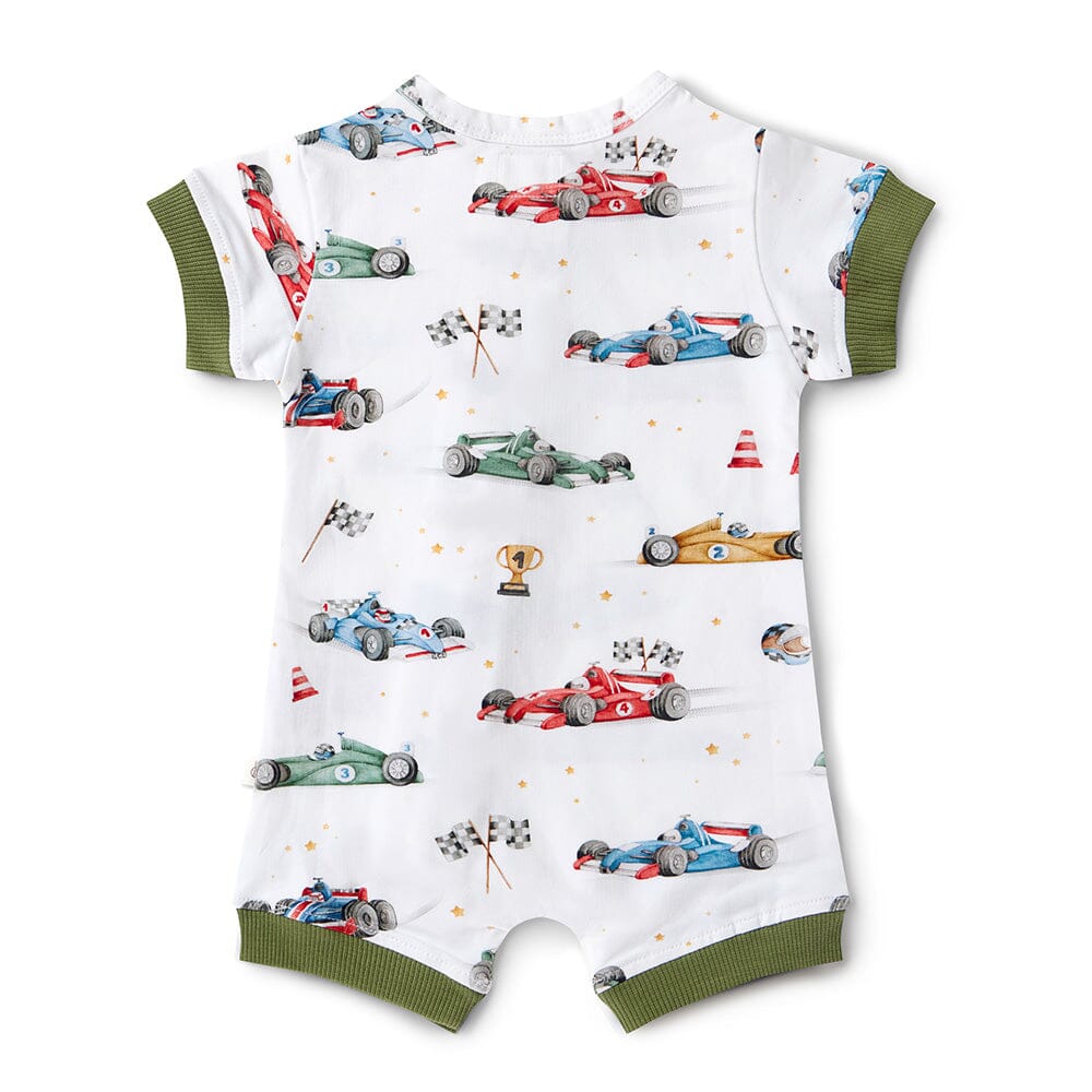 The Snuggle Shortie is a short sleeve 'shortie' romper style available in exclusive Snuggle Hunny prints. An easy and comfortable one-item outfit for bub, made from our printed organic cotton jersey with contrast rib around the arms and legs.