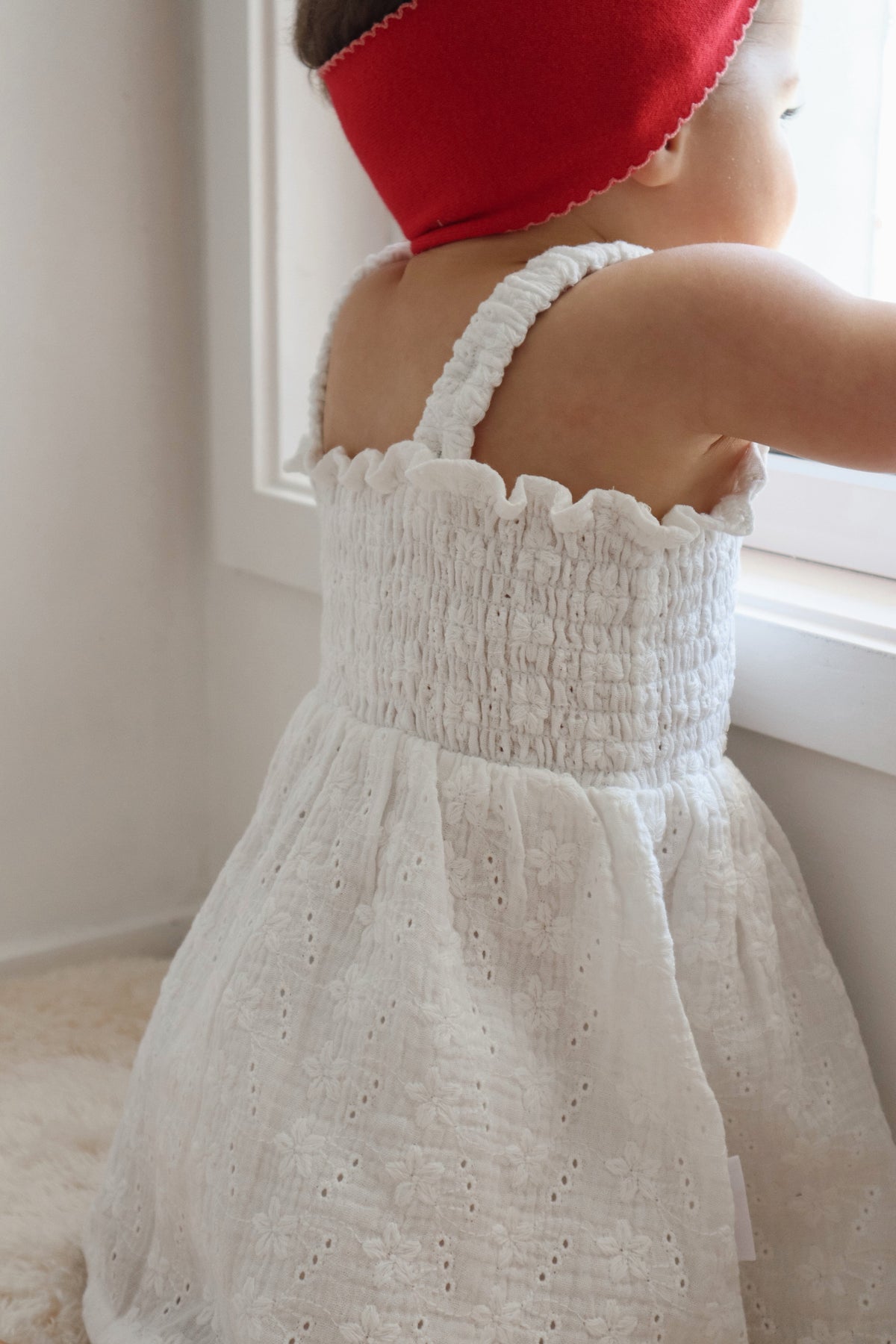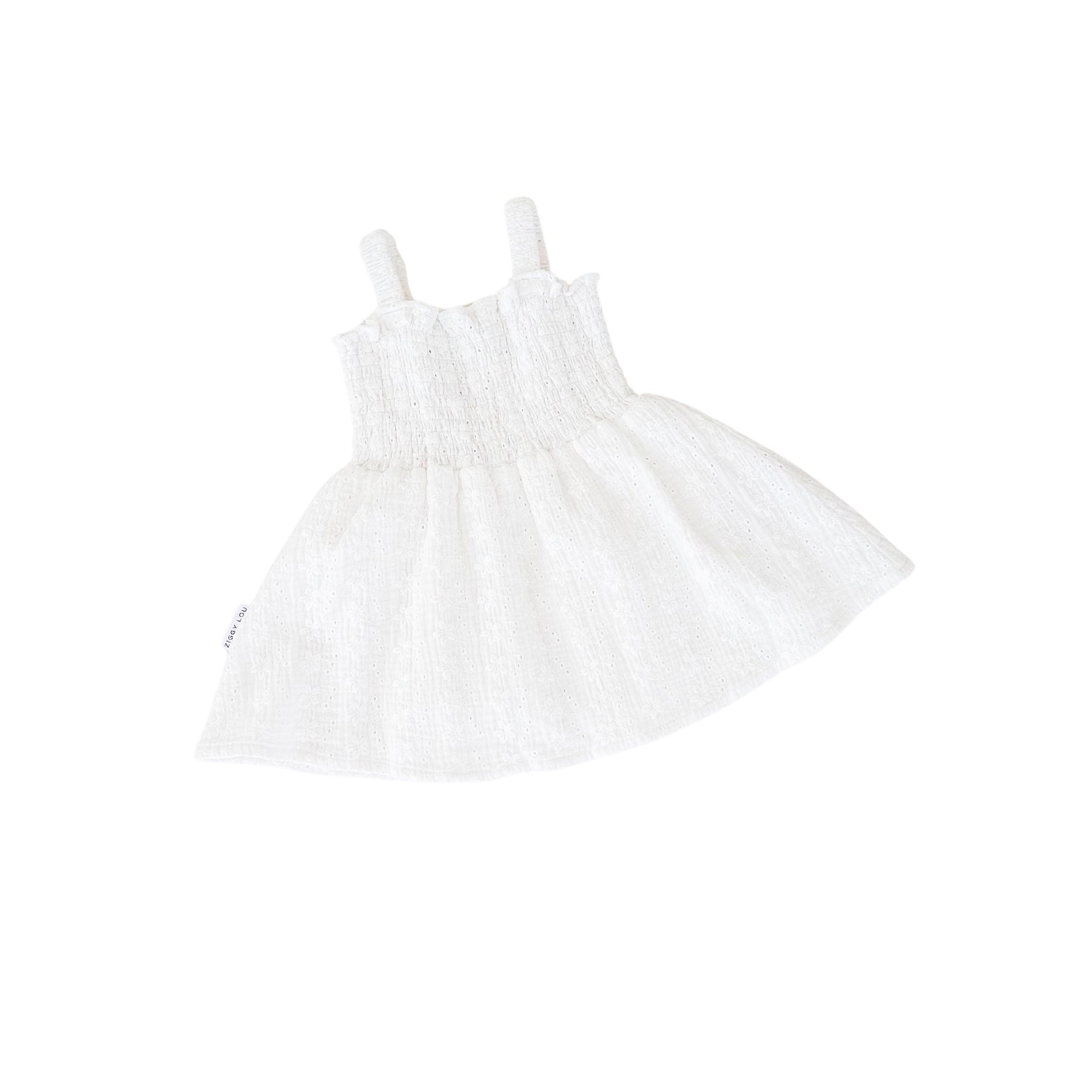 Cotton dress in our Laurel broderie anglaise fabric. Shirred bodice with adjustable button hole straps. Mix and match with items from our Christmas Collection.
