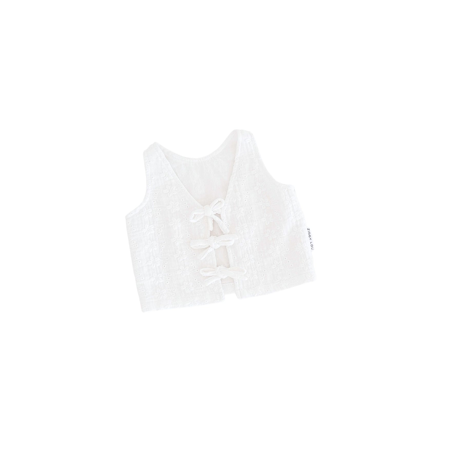 Cotton singlet in our Laurel broderie anglaise fabric. Functional ties down the middle, can be worn in reverse. Mix and match with items from our Christmas Collection.